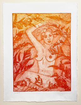 Intaglio printmaking has been an important part of Cesarine’s artistic practice since she first started creating. Some of her earliest etchings date back to her high school days when she started studying intaglio etching as well as screen printing and other forms of printmaking. Her more recent works often feature vibrant inks in hues of pink, orange, and red. Her etchings are inspired by women’s history and the female gaze, often taking as inspiration historical figures from mythology, philosophy, media, and literature.